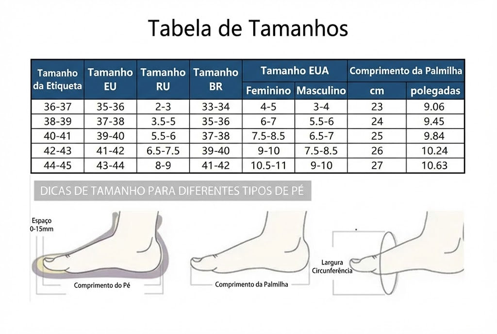 Consulte a tabela abaixo e escolha o tamanho de acordo com o comprimento do seu pé: